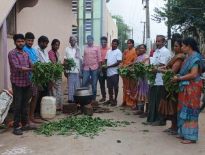 పార్వతీపురం మన్యం జిల్లా, సాలూరు మండలం ,మామిడిపల్లి గ్రామంలో వరిలో వచ్చే సుడి దోమ నివారణ కొరకు ప్రకృతి వ్యవసాయ సిబ్బంది ఆధ్వర్యంలో రైతులు సామూహికంగా తూటి కాడ కషాయం తయారీ జరిగింది. ఈ సుడి దోమ లేదా దోమ ఎక్కువగా వరిలో చిరుపొట్ట దశ, పొట్టదశ , ఈనుక దశ లో ఎక్కువగా వస్తుంది అని వాతావరణం లో ఇరవై అయిదు డిగ్రీల సెంటిగ్రేట్ నుండి ముప్పై డిగ్రీల సెంటిగ్రేట్ ఉష్ణోగ్రత ఉన్నప్పుడు ఈ సుడి దోమ వృద్ది చెందుతుంది అని నత్రజని ఎరువులు ఎక్కువ గా వాడటం వలన దోమ ఉదృత పెరుగుతుందని, సుడి దోమ వలన ఆర్ధిక నష్టపరిహారం జరుగుతుందని, వీటికి రాజీలేని సూత్రాలు వరి చిగుళ్ళు కట్ చేసి వరుస క్రమ పద్దతిలో నాట్లు వేసుకోవటం ప్రతి రెండు మీటర్లుకు ఇరవై సెంటిమీటర్లు కాలిబాటలు తీసుకోవటం వలన సుడి దోమ ఉదృత పెరగకుండా ఉంటుందని, ఈ సుడి దోమ నివారణకు 10 కేజీల తూటి కాడ ఆకులు పదిహేను లీటర్లు నీటిలో నాలుగు పొంగులు వచ్చేటట్లు ఉడికించి చల్లార్చిన తరువాత 15 లీటర్లు దేశి ఆవు మూత్రం కలిపి వడపోసుకుని 5 నుండి 6 లీటర్ల తూటికాడ కషాయాన్ని కుంకిడి కాయలు రసం,100 లీటర్ల నీటిలో కలిపి వరి మొదల్లు పయిన పడేలా పిచికారీ చేయటం వలన తూటికాడ లో ఆల్కళాయిడ్లు ఎక్కువగా ఉండటం వలన వరిలో సుడిదోమ నివారణ అవుతుందని, ప్రకృతి వ్యవసాయ సిబ్బంది రైతులకు అవగాహన కల్పించడం జరిగింది.ఈ కార్యక్రమంలో రైతులు ప్రకృతి వ్యవసాయ సిబ్బంది హాజరయ్యారు.